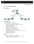 Lab 5.6.1: Basic RIP Configuration Topology Diagram Learning Objectives Upon completion of this lab, you will be able to: Cable a network according to the Topology Diagram. Erase the startup configuration and reload a router to the default state. Perform basic configuration tasks on a router. Configure and activate interfaces. Configure RIP routing on all routers. Verify RIP routing using show and debug commands. Reconfigure the network to make it contiguous. Observe automatic summarization at boundary router. Gather information about RIP processing using the debug ip rip command. Configure a static default route. Propagate default routes to RIP neighbors. Document the RIP configuration. Scenarios Scenario A: Running RIPv1 on Classful Networks Scenario B: Running RIPv1 with Subnets and Between Classful Networks Scenario C: Running RIPv1 on a Stub Network. All contents are Copyright © 1992–2007 Cisco Systems, Inc. All rights reserved. This document is Cisco Public Information. Page 1 of 17 CCNA Exploration Routing Protocols and Concepts: RIP version 1 Lab 5.6.1: Basic RIP Configuration Scenario A: Running RIPv1 on Classful Networks Topology Diagram Addressing Table Device Interface IP Address Subnet Mask Default Gateway Fa0/0 192.168.1.1 255.255.255.0 N/A S0/0/0 192.168.2.1 255.255.255.0 N/A Fa0/0 192.168.3.1 255.255.255.0 N/A S0/0/0 192.168.2.2 255.255.255.0 N/A S0/0/1 192.168.4.2 255.255.255.0 N/A Fa0/0 192.168.5.1 255.255.255.0 N/A S0/0/1 192.168.4.1 255.255.255.0 N/A PC1 NIC 192.168.1.10 255.255.255.0 192.168.1.1 PC2 NIC 192.168.3.10 255.255.255.0 192.168.3.1 PC3 NIC 192.168.5.10 255.255.255.0 192.168.5.1 R1 R2 R3 All contents are Copyright © 1992–2007 Cisco Systems, Inc. All rights reserved. This document is Cisco Public Information. Page 2 of 17 CCNA Exploration Routing Protocols and Concepts: RIP version 1 Lab 5.6.1: Basic RIP Configuration Task 1: Prepare the Network. Step 1: Cable a network that is similar to the one in the Topology Diagram. Task 2: Clear existing configurations Step 2: Clear any existing configurations on the routers. ROUTER# erase startup-config Task 3: Configure and Activate Serial and Ethernet Addresses. Use basic router configuration commands from previous weeks’ worksheets. Step 1: Configure interfaces on R1, R2, and R3. Configure the interfaces on the R1, R2, and R3 routers with the IP addresses from the table under the Topology Diagram. Step 2: Verify IP addressing and interfaces. Use the show ip interface brief command to verify that the IP addressing is correct and that the interfaces are active. When you have finished, be sure to save the running configuration to the NVRAM of the router. Step 3: Configure Ethernet interfaces of PC1, PC2, and PC3. Configure the Ethernet interfaces of PC1, PC2, and PC3 with the IP addresses and default gateways from the table under the Topology Diagram. Step 4: Test the PC configuration by pinging the default gateway from the PC. Task 4: Configure RIP. Step 1: Enable dynamic routing. To enable a dynamic routing protocol, enter global configuration mode and use the router command. Enter router ? at the global configuration prompt to a see a list of available routing protocols on your router. To enable RIP, enter the command router rip in global configuration mode. R1(config)#router rip R1(config-router)# Step 2: Enter classful network addresses. Once you are in routing configuration mode, enter the classful network address for each directly connected network, using the network command. R1(config-router)#network 192.168.1.0 R1(config-router)#network 192.168.2.0 R1(config-router)# All contents are Copyright © 1992–2007 Cisco Systems, Inc. All rights reserved. This document is Cisco Public Information. Page 3 of 17 CCNA Exploration Routing Protocols and Concepts: RIP version 1 Lab 5.6.1: Basic RIP Configuration The network command: Enables RIP on all interfaces that belong to this network. These interfaces will now both send and receive RIP updates. Advertises this network in RIP routing updates sent to other routers every 30 seconds. R1(config-router)#end R1#copy run start Step 3: Configure RIP on the R2 router using the router rip and network commands. R2(config)#router rip R2(config-router)#network 192.168.2.0 R2(config-router)#network 192.168.3.0 R2(config-router)#network 192.168.4.0 R2(config-router)#end When you are finished with the RIP configuration, return to privileged EXEC mode and save the current configuration to NVRAM. R2#copy run start Step 4: Configure RIP on the R3 router using the router rip and network commands. R3(config)#router rip R3(config-router)#network 192.168.4.0 R3(config-router)#network 192.168.5.0 R3(config-router)#end R3# copy run start Task 5: Verify RIP Routing. Step 1: Use the show ip route command to verify that each router has all of the networks in the topology entered in the routing table. Routes learned through RIP are coded with an R in the routing table. If the tables are not converged as shown here, troubleshoot your configuration. Did you verify that the configured interfaces are active? Did you configure RIP correctly? Return to Task 3 and Task 4 to review the steps necessary to achieve convergence. All contents are Copyright © 1992–2007 Cisco Systems, Inc. All rights reserved. This document is Cisco Public Information. Page 4 of 17 CCNA Exploration Routing Protocols and Concepts: RIP version 1 Lab 5.6.1: Basic RIP Configuration R1#show ip route Codes: C - connected, S - static, I - IGRP, R - RIP, M - mobile, B - BGP D - EIGRP, EX - EIGRP external, O - OSPF, IA - OSPF inter area N1 - OSPF NSSA external type 1, N2 - OSPF NSSA external type 2 E1 - OSPF external type 1, E2 - OSPF external type 2, E - EGP i - IS-IS, L1 - IS-IS level-1, L2 - IS-IS level-2, ia - IS-IS inter area * - candidate default, U - per-user static route, o - ODR P - periodic downloaded static route Gateway of last resort is not set C C R R R R1# 192.168.1.0/24 192.168.2.0/24 192.168.3.0/24 192.168.4.