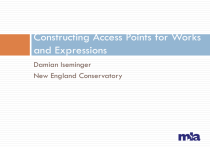 Constructing Access Points for Works and Expressions Damian Iseminger New England Conservatory Access Points for Works Can represent: A single work Part or parts of a work A compilation of works Access Points for Works General instruction The authorized access point for the person, family, or corporate body responsible for the work The preferred title for the work Specific instructions RDA 6.27.1-6.27.2 (except for musical works, legal works, religious works, and official communications) RDA 6.28.1-6.28.2 (musical works) Format RDA Appendix E No “rule of three” Works with shared responsibility Unless the work is considered a compilation, all collaborations will have an authorized access point consisting of: The authorized access point for the person, etc. indicated as being primarily responsible for the content OR the person, etc. first-named in the resource The preferred title of the work Use of “Selections” May be used when a compilation consists of two or more works Access Points for Musical Works Person, Family, or Corporate Body Responsible for the Work Categories of Works Musical works with lyrics, librettos, text etc. (6.28.1.2) Pasticcios, ballad operas, etc. (6.28.1.3) Works composed for choreographic movement (6.28.1.4) Adaptations of musical works (6.28.1.5) Operas and other dramatic works with new text and title (6.28.1.6) Cadenzas (6.28.1.7) Music and incidental music for dramatic works, etc. (6.28.1.8) Other types (6.27.1) Similarities Between RDA and AACR2 RDA 6.28.1.2 (Words) 6.28.1.3 (Pasticcio) 6.28.1.4 (Ballets) 6.28.1.5 (Adaptations) 6.28.1.7 (Cadenzas) 6.28.1.8 (Incidental) AACR2 21.19A 21.19B ≈ ≈ = Roughly ≈ ≈ 21.20 21.18C 21.28 ≈ 21.28 Changes in RDA from AACR2 New categories in Adaptations (6.28.1.5) c) Harmony or musical style of the original work has been changed d) Performances of musical works involving substantial creative responsibility for adaptation, improvisation, etc. on the part of the performer Apply these conservatively and with caution! Librettos (6.27.1) Author of the libretto used in the name portion of the authorized access point No alternative present, as in AACR2 Access Points for Musical Works Individual Work Preferred Titles Introduction Instructions located in RDA 6.14 General rules for capitalization, form of numbers, diacritics, initial articles, spacing of initials and acronyms and abbreviations in preferred titles located at 6.2.1 Capitalization instructions allow for the recording of unusual capitalization six bucks for anabelle's firetruck Initial articles Default position: record initial articles Alternative: omit initial articles, unless the title is to be accessed under that article Die Meistersinger von Nürnberg BUT Los Angeles Street concerto Introduction Punctuation reflects the usage of the source of the preferred title On resource: Requiem in/for C Preferred On title: Requiem in/for C resource: Sunny side [of my soul] up YES: Sunny side [of my soul] up NO: Sunny side (of my soul) up On resource: What is it? …what is it not? YES: What is it? …what is it not? NO: What is it? --what is it not? Choosing the Preferred Title Sources of information (6.14.2.2) After 1500: Resources embodying the work or reference sources Before 1501: Modern reference sources, or, failing that, use in this order: modern editions, early editions, ms. copies Choosing (6.14.2.3) Composer’s original title in the language in which it was presented Exceptions for Better known title in the same language Long titles Numbered sequence (the Eroica exception) Recording the Preferred Title Manipulation (6.14.2.4) Remove A statement of medium of performance Consider a due, a cinque or equivalent phrases in pre-twentieth century works to be a statement of medium Key Serial, opus, and thematic index numbers Numbers (unless an integral part of the title) Date of composition Adjectives and epitaphs not part of the original work title Consider the word concertant or its equivalent in pre-twentieth works to be an adjective, etc. if paired with a word denoting the number of instruments or voices, e.g. Duo concertant, Quartetto concertant Sonata no. 3 for cello and piano in A major, op. 69 Recording the Preferred Title Transformation (6.14.2.5) For preferred titles consisting solely of the name of one type of composition Record “in a language preferred by the agency creating the data” and in the plural, unless the composer wrote only one work of that type No longer using “cognates” as in AACR2 Record the accepted form of name in English (LC-PCC PS 6.14.2.5) Konzert = Concertos Lieder = Songs Gesänge = Songs Morceaux = Pieces Stücke = Pieces Recording the Preferred Title Best Practices recommendations If a composition has a preferred title of a type, but the work is not of that type, do not consider it a type of composition. La valse : poème chorégraphique pour orchestre / Maurice Ravel Preferred title: Valse NOT Waltzes Do not consider titles such as “Double concerto” or “Tripelkonzert” to be types of composition Compound titles consisting entirely of types should be treated as distinctive titles Humoreske-bagateller Consists of two types, but in this case “Humoreske” is modifying “bagateller,” so treat as a distinctive title Recording the Preferred Title No RDA instruction for “Trio sonatas” May be used as a type title, but only if resources embodying the work or reference sources use the term or its equivalent in other languages Triosonate, D-Dur, für zwei Violinen und Basso continuo (1701) = Trio sonatas BUT Sonate, F-Dur, für Flöte, Violin, und Basso continuo (1705) = Sonatas Access Points for Musical Works Complete and Incomplete Compilations Complete Compilation Types Complete Works (6.14.2.8.2) Record Works Complete Works of Various Types for One Broad Medium (6.14.2.8.3) Chamber music Choral music Instrumental music Keyboard music Vocal music Complete Compilation Types Complete Works of Various Types for One
