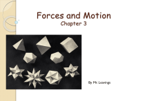 Forces and Motion Chapter 3 By Mr. Leavings And just what are we going to LEARN? Explain the meaning of Force Show how force is required to change the motion of an object Explain and discuss Newton’s three laws, the first dealing with inertia, the second with force, third with equal but opposite reactions Describe how changing the mass of a car affects its acceleration Demonstrate how friction can affect motion Identify action-reaction pairs of forces Force, Mass and Acceleration Physics Teacher: "Isaac Newton was sitting under a tree when an apple fell on his head and he discovered gravity. Isn't that wonderful?" Student: "Yes sir, if he had been sitting in class looking at books like us, he wouldn't have discovered anything." THE LAWS Law 1st 2nd 3rd Statement In your own words: An object at rest will remain at rest unless acted on by an unbalanced force. An object in motion will continue with constant speed and direction, unless acted on by an unbalanced force. Objects keep doing what they are doing unless something intervenes. The acceleration of an object is directly proportional to the force acting on it and inversely proportional to its mass. If net force, then acceleration. Heavier objects are harder to move. Whenever one object exerts a force on another, the second object exerts an equal and opposite force on the first. Action, reaction. Force, Mass and Acceleration If I asked you to move a cart containing a large, heavy box, would you: a) Push it b) Pull it c) Yell at it till it went where you wanted Every object continues at a state of rest, or of motion, unless a FORCE is applied to change the system. Force, Mass and Acceleration Force: an action that has the ability to change motion. Force is described in two units: Pounds and Newtons (there are 4.448 Newtons in 1 pound) Newton = 1 kg x m sec2 Newton’s 1st Law An object at rest will remain at rest unless acted on by an unbalanced force. An object in motion will continue with constant speed and direction, unless acted on by an unbalanced force. Newton’s 1st Law Demo: Ring and the Flask Challenge: get the object into the flask. Rules: Only touch the hoop. Quickest time wins. Newton’s 1st Law Force ◦ Any action that has the ability to change motion. ◦ i.e. a push or pull ◦ Forces don’t always change motion ◦ Units of force: pounds, newtons 1lb = 4.448 N Newton’s 1st Law The Difference Between Force and Mass ◦ force: newtons ◦ mass: grams, kilograms Force is a push or pull Mass is the amount of “stuff” in an object. Mass is the same everywhere in the universe, force depends on what is acting on the mass. Newton’s 1st Law Inertia is the tendency of an object to resist changes in its velocity: whether in motion or motionless. These pumpkins will not move unless acted on by an unbalanced force. Newton’s 2nd Law Newton's second law relates to the applied force on an object. The acceleration of an object is directly proportional force acting upon it and inversely proportional to the mass of the object. Newton’s 2nd Law Newton’s 2nd Law It says that: • Force causes acceleration • Mass resists acceleration • The acceleration you get is equal to the ratio of force over mass Newton’s 2nd Law Form of Newton’s second law If you want to know… And you know…. a = F/m the acceleration (a) the mass (m) and force (F) F = ma the force (F) the mass (m) and the acceleration (a) m = F/a the mass (m) the force (F) and the mass (m) Newton’s 2nd Law An example: A car rolls down a ramp and you measure a force of 2 Newtons pulling the car. The car has a mass of 500 g (0.5kg). Calculate the acceleration of the car. What do we Know? M = 0.5 kg F=2N A=? Newton’s 2nd Law Another example: An airplane with a mass of 5000 kg needs to accelerate at 5 m/s2 to take off before it reaches the end of its runway. How much force is needed from the engine? What do we Know? M = 5000 kg F=? A = 5 m/s2 Newton’s 2nd Law Even another example: An snail slimes along with a force of 0.05 Newtons (N). If its acceleration is 0.1 m/s2, what is the mass of the slug? What do we Know? M=? F = 0.05 N A = 0.1 m/s2 Balanced and Unbalanced Forces Net Force: The motion of an object depends on the total of all forces acting on it. To figure out Net Force we have to assign directions for forces to be either positive or negative. Positive Negative Balanced and Unbalanced Forces Positive 500 N Positive 490 N Negative 10 N The above forces are not in equilibrium and the car moves forward. If the forces were equal the car would not move. Balanced and Unbalanced Forces example: An person is pushing on a car to keep it from moving with a force of 3 N. The car has a mass of 500 kg. The driver steps on the gas causing the car to accelerate at 2 m/s2. What happens? What do we Know? Fn = 3 N Fp = ? M = 500 kg A = 2 m/s2 Positive ? Negative 3N Balanced and Unbalanced Forces Newton’s 2nd Law is really describing the NET FORCE. Acceleration can only happen if the net force is not zero. Balanced and Unbalanced Forces Force Diagrams show all the different forces acting on an object. They can also show magnitudes by changing the arrow size, or by including numbers. FN FG Balanced and Unbalanced Forces Force of Gravity (FG): Pulls an object straight down Normal Force (FN): Force on an object from support (like a table) that is perpendicular to the support FN FG Balanced and Unbalanced Forces Force of Friction (Ff): Force that acts against another force if there is motion. Tension Force (FT): Force acting on an object if it is suspended from something. Applied Force (Fapp): Any force acting on an object other than those already mentioned. Balanced and Unbalanced Forces This diagram shows four forces acting upon an object. There aren’t always four forces, For example, there could be one, two, or three forces. Ff FN FG Fapp Balanced and Unbalanced Forces A man drags with his daughter inside with a rightward acceleration. Draw a force diagram of the sl