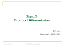 Topic 9: Product Differentiation EC 3322 Semester I – 2008/2009 Yohanes E. Riyanto EC 3322 (Industrial Organization I) 1 Introduction Firms produce similar but not identical products (differentiated) in many different ways. Horizontally Goods of similar quality targeted at consumers of different types/ preference/ taste/ location How is variety determined? How does competition influence the equilibrium variety. Vertically Consumers agree that there are quality differences. They differ in willingness to pay for quality. Yohanes E. Riyanto What determine the quality of goods? EC 3322 (Industrial Organization I) 2 Introduction … Modeling horizontal product differentiation: Representative Consumer Model Firms producing differentiated goods compete equally for all consumers. Demand is continuous the usual (inverse) demand function a small change in any one firm’s quantity (or price) a small change in demand. Spatial/ Location/ Address Model Consumers may prefer products with certain characteristics (taste, location, sugar contents, etc) are willing to pay premium for the preferred products. Demand maybe independent (not close substitutes) or highly dependent (close substitutes) Yohanes E. Riyanto EC 3322 (Industrial Organization I) 3 Representative Consumer Model Recall that with homogenous goods demand: Pi P D q1 , q2 ..., qN Pi P D q1 q2 ... qN With 2 firms P A B q1 q2 with B1 B2 With differentiated products: A 0 and Bi B j Pi A Bi qi B j q j with j i where With more than two firms, we can write: N Pi A Bi qi B j q j with j i j 1 N q j the sum of the quantity of all firms j 1 except firm i. Yohanes E. Riyanto EC 3322 (Industrial Organization I) 4 Representative Consumer Model… Coke and Pepsi are similar but not identical. As a result, the lower priced product does not win the entire market. Suppose that econometric estimation gives: QC = 63.42 - 3.98PC + 2.25PP MCC = $4.96 QP = 49.52 - 5.48PP + 1.40PC MCP = $3.96 There are at least two methods for solving this for PC and PP. Assume that we have Bertrand competition. Yohanes E. Riyanto EC 3322 (Industrial Organization I) 5 Representative Consumer Model… Method 1: Calculus Profit of Coke: ΠC = (PC - 4.96)(63.42 - 3.98PC + 2.25PP) Profit of Pepsi: Π P = (PP - 3.96)(49.52 - 5.48PP + 1.40PC) Differentiate with respect to PC and PP respectively first order conditions optimal Pc and Pp. Method 2: MR = MC Reorganize the demand functions PC = (15.93 + 0.57PP) - 0.25QC Pc (Qc,Qp) PP = (9.04 + 0.26PC) - 0.18QP Pp (Qc,Qp) Calculate marginal revenue, equate to marginal cost, solve for QC and QP and substitute in the demand functions Yohanes E. Riyanto EC 3322 (Industrial Organization I) 6 Representative Consumer Model… Both methods give the best response functions: PC = 10.44 + 0.2826PP PP PP = 6.49 + 0.1277PC These can be solved for the equilibrium prices as indicated The equilibrium prices are each greater than marginal cost The Bertrand Note that these equilibrium are upwardis at their sloping intersection $8.11 B RP $6.49 $10.44 Yohanes E. Riyanto RC EC 3322 (Industrial Organization I) PC $12.72 7 Location Model Typically, brands (products) compete vigorously with those that consumers view as close substitutes. Close substitutes-ness could either depends on the perception of consumers or physical or product attributes. “Location” based model tries to capture the notion of close substitutes location can be interpreted as: Geographic location e.g. the location of the outlet (store). Time e.g. departure time, showing time. Product characteristics design and variety e.g. diet coke vs regular coke, sweetness and crunchiness of cereals. sweetness scale Koko Crunch Kellog Corn Flakes crunchiness scale Yohanes E. Riyanto EC 3322 (Industrial Organization I) 8 Location Model… Based on Hotelling (1929) Hotelling’s Linear Street Model. Imagine e.g. a long stretch of beach with ice cream shops (sellers) along it. The model discusses the “location” and “pricing behavior” of firms. Basic Setup: N-consumers are uniformly distributed along this linear street thus in any block of the street there are an equal number of consumers. Consumers are identical except for location and each of them are considering buying exactly one unit of product as long as the price paid + other costs are lower than the value derived from consuming the product (V). As a benchmark, consider for the time being the case of a monopoly seller operates only 1 store it is reasonable to expect that it is located in the middle. Consumers incur “transportation” costs per unit of distance (e.g. mile) traveled, t. Yohanes E. Riyanto EC 3322 (Industrial Organization I) 9 Location Model… uniform distribution with density N n N 1 0 street line Yohanes E. Riyanto EC 3322 (Industrial Organization I) 10 Hotelling Model… Price Suppose that the monopolist Price sets a price of pp11 + t.x p1 + t.x V V All consumers within distance x1 to the left and right of the shop will by the product z=0 t x1 t p1 1/2 Shop 1 What determines x 1? x1 z=1 p1 + t.x1 = V, so x1 = (V – p1)/t Yohanes E. Riyanto EC 3322 (Industrial Organization I) 11 Hotelling Model… Price p1 + t.x p1 + t.x Suppose the firm reduces the price to p2? V Then all consumers within distance x2 of the shop will buy from the firm z=0 Price V p1 p2 x2 x1 1/2 x1 x2 z=1 Shop 1 Yohanes E. Riyanto EC 3322 (Industrial Organization I) 12 Hotelling Model… Suppose that all consumers are to be served at price p. The highest price is that charged to the consumers at the ends of the market. Their transport costs are t/2 : since they travel ½ mile to the shop So they pay p + t/2 which must be no greater than V. So p = V – t/2. Suppose that marginal costs are c per unit. Suppose also that a shop has set-up costs of F. t Then profit is N V c F 2 Yohanes E. Riyanto EC 3322 (Industrial Organization I) 13 Hotelling Model… Price p1 + t.x p2 + t.x p1 + t.x V p3 + 1/2t Price p2 + t.x V p1 p2 p3 z=0 x3 Yohanes E. Riyanto x2 x1 1/