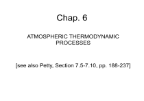 Chap. 6 ATMOSPHERIC THERMODYNAMIC PROCESSES [see also Petty, Section 7.5-7.10, pp. 188-237] Objectives: 1. Develop other important thermodynamic variables and applications of the fundamental relations that we have considered to this point. 2. Use and applications the skew-T diagram to examine atmospheric processes. 3. Examine some important atmospheric thermodynamic processes. In particular, we will explore the behavior of water vapor and its effects on atmospheric processes. Saturation is common in the atmosphere Near the surface on clear, calm nights http://vortex.nsstc.uah.edu/mips/data/current/surface/ Saturation is common in the atmosphere BNA LCH Formation, evolution, and movement of clouds Saturation is common in the atmosphere Depiction of saturation in a skew-T, ln p sounding (1200 UTC, 13 Sept 2007, Lake Charles, LA) Thick Ci clouds 6.1.1 Some processes that define additional thermodynamic variables There are four natural processes by which saturation can be attained in the atmosphere. These are: • isobaric cooling (dq0, rv=const), e.g., by radiative cooling (diabatic cooling, dq < 0), in which the temperature T approaches the dew point temperature Td; • evaporational cooling (dq0, rvconst) in which a decrease in T and an increase in Td result in the wet-bulb temperature Tw, (at which point the air is saturated); • adiabatic cooling (dq=0, rv=const) in which saturation is produced at the saturation point temperature[1] Tsp by adiabatic expansion; • mixing of two air masses – in this case saturation can be analyzed from a “saturation point” mixing analysis. [1] The saturation point temperature is also known as the temperature of the lifting condensation level (Tlcl) or the isentropic condensation temperature (Tc). = const e = const Saturation adiabat Dry adiabat rvs = const T = const saturation point coordinates: psp, Tsp psp T sp Td Tw T p Figure 6.2. Illustration of processes by which saturation may be achieved in the atmosphere. This skew-T diagram also illustrates the graphical method to determine Td, Tw and Tsp. Illustration of Normand's rule. This is an important figure!!! Upper air observations http://www.vaisala.com/businessareas/measurementsystems/soundings/products/radioson a) Isobaric cooling and the dew point temperature, Td. isobaric process (radiational) cooling occurs in the presence of constant water vapor (e=const or rv=const). Under clear sky conditions the radiational cooling frequently reduces the surface temperature to the dewpoint temperature. Cooling is greatest at the surface, as illustrated in Fig. 6.1, a 1200 UTC sounding from Salem, Oregon. T and Td are nearly superimposed (i.e., the air is saturated) and fog was reported in the region. This sounding was obtained from the web site http://www.rap.ucar.edu/weather/upper.html An even better example of a surface based T inversion and saturation T Td (RH 100%) Low winds in the NBL + clear skies + dry air above 1 km = maximum surface cooling Relation between Dqrad and DT Fluctuating wind (turbulent bursts) Further illustration: For the next two weeks, refer to T, Td time series over night from http://vortex.nsstc.uah.edu/mips/data/current/surface/. Derivation of Td: dp=0, dq0 and dh=dq. Physical process: As isobaric cooling proceeds with no change in the absolute moisture content, a temperature is reached in which the air just becomes saturated (T=Td, or e = es). Consider the relationship between Td and the relative humidity f. We can write rv = rvs (p,Td) (definition) and use an expression for es(T) and the approximate relation rvs=ees/p. We begin with the integrated approximation of the C-C equation: es = Ae-B/T (6.1) Take the natural log of each side (i.e., ln es = ln A - B/T), utilize the approximate formula es=prvs/e, and then solve for T (which is Td in this case). The approximate analytical expression for Td in terms of rv and p can then be expressed as Td Td (rvs , p) B Ae ln rv p (6.2) This relation explicitly shows that Td is a function of rv and p. Given values of rv and p, one can graphically determine Td on a skew-T as shown in Fig. 6.2 below. As an extension of this problem, we will consider fog formation in Section 6.4.1. The accuracy of this relation is dependent on the accuracy of es = Ae-B/T [accurate to about 1% in the -20 to +20 C interval] QuickTime™ and a TIFF (Uncompressed) decompressor are needed to see this picture. From Petty. Relationship between Td and relative humidity f. Determine how relative changes in Td are related to relative changes in f. Again, we utilize the formula e prv e and take the log differential to get dlne = dlnp + dlnrv. (6.3) Combine (6.3) with the Clausius-Clapeyron equation, written in differential form d ln e dTd L vl R v Td 2 (here e = es since T=Td) (6.4) to obtain, after some rearranging, the following: dTd , R v Td 2 L vl ( d ln p d ln rv ) Depends on relative variations in p and rv Dividing both sides by Td yields dTd RvTd d ln Td (d ln p d ln rv ) 5x10 2 (d ln p d ln rv ) Td Lvl where the latter approximate equality is obtained from the term [RvTd/Lvl] by assuming Td=270 K, Lvl=2.5x106 J kg-1, and Rv= 461 J kg-1 K-1 . This result indicates that the relative increase in Td (here, relative refers to the ratio dTd/Td, or an incremental change relative to the total value) is about 5% the sum of the relative increases in p and rv. We now integrate the C-C eq. (6.4) above to get es 1 ln ln f e Rv T T d L vl T 2 dT L vl T Td R v TTd . We then solve for so-called dewpoint depression (T-Td), use decimal logarithms [using the definition that log10 x = ln x / ln 10 = 0.43429 ln x], and substitute for constants to get (T-Td) = 4.25x10-4 TTd(-log10f) For TTd =2902 (i.e., assuming T = 290 K and Td = 290 K) we have T-Td 35(-log10f) (6.5) Then for f=0.8, (T-Td) 3.5 C = 6.3 F. Thus, a change of (T-Td) every 1 F translates to a change in f of about 3.2%. This verifies my general rule of thumb that [at least] for f > 0.8, the dewpoint depression, T-Td, i