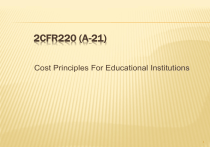 2CFR220 (A-21) Cost Principles For Educational Institutions 1 Cost Principles For Educational Institutions Defines allowable and unallowable costs (the “J” section)Defines payroll distribution systems (a.k.a. “effort reporting”) Defines methods of F&A cost rate identification and calculation Establishes Cost Accounting Standards. 2 DIRECT COSTS Costs that can be identified specifically with a particular sponsored project, an instructional activity, or any other institutional activity; or That can be directly assigned to such activities relatively easily with a high degree of accuracy Examples of Direct Costs: Salary of researcher (including benefits costs) Laboratory supplies purchased for project Technician 3 FACILITIES AND ADMINISTRATIVE (F&A) COSTS (INDIRECT COSTS) Costs that are incurred for common or joint objectives, and, therefore, cannot be identified readily and specifically with a particular sponsored project, an instructional activity, or any other institutional activity (Section E.1) Examples of F&A Costs: Salary of department administrator Building utility and maintenance costs President, Provost, and CFOs offices 4 TOTAL PROJECT COSTS (A-21, C.1) Direct Costs (Directly benefit a specific sponsored project) + F&A Costs (Cannot be attributed to a specific project) ------------------------------= Total Project Costs 5 WHAT DOES “ALLOWABLE” MEAN? An “allowable” cost is one that is eligible for reimbursement by the federal government. Contrast with: PERMISSIBLE BY INSTITUTION: A cost is permitted by institution, as outlined in its various administrative procedures. ALLOWABLE BY AGENCY: A cost is permitted by the terms of the sponsoring agency. An "unallowable" cost is one that is not eligible for reimbursement by the federal government. 6 WHAT IS AN “ALLOWABLE” COST? An allowable cost must be: Reasonable: A prudent business person would have purchased this item and paid this price. Allocable: It can be assigned to the activity on some reasonable basis. Consistently Treated: Like costs must be treated the same in like circumstances, as either direct or F&A costs. Conform to Terms: In A-21 or the Sponsored Agreement. Cost must meet all four standards to be considered allowable! 7 WHAT DOES “REASONABLE” MEAN? A cost is reasonable if … The nature of the good or service and the amount involved reflect the action of a prudent person. Considerations in determining reasonableness: Necessary for the performance of the sponsored agreement; Determined by arm’s length bargaining of a prudent person; In accordance with the sponsored agreement terms and conditions; Consistent with established institutional policies and practices 8 ALLOCABILITY A cost can be allocable as a direct or an indirect cost A cost is allocable as a direct cost if the goods or services provided are assignable in accordance with the relative benefits received…. It is incurred solely to advance the work under the sponsored agreement It benefits both the work under the sponsored agreement and other work of the institution in proportions that can be approximated Allocate costs based on benefit to projects 9 ALLOCATING DIRECT COSTS Proportional benefit Cost benefits two or more projects in proportions that can be determined without undue effort or cost Any reasonable basis Proportional benefit between projects cannot be determined because of the interrelationship of the work involved; allocate costs between projects on any reasonable basis Who determines reasonable basis? 10 EXAMPLES: ALLOCABILITY OF COSTS Travel by PI to conference (not related to specific project) Not allocable as direct charge to sponsored award. Salary of research technician Allocable as direct cost, not as F&A cost Salary of administrative assistant Allocable as F&A, not normally allocable as direct charge to a sponsored project Proposal preparation costs Not allocable as direct charge to sponsored award. 11 EXAMPLES OF WHEN COSTS MAY NOT BE ALLOCATED Costs can not be allocated: to meet deficiencies caused by overruns, to avoid restrictions imposed by law or terms of the sponsored agreement, for other reasons of convenience, or the big “No No”… …Because one project has more funds! 12 CONSISTENTLY TREATED: COST ACCOUNTING STANDARDS (APPENDIX A) Each Institution Shall Follow Four CAS Standards: CAS 501: CAS 502: Consistently follow its established cost accounting practices when estimating, accumulating, and reporting costs Consistently allocate costs incurred for the same purpose, in like circumstances, as either direct or F&A costs as they relate to the final cost objective CAS 505: CAS 506: Identify and exclude unallowable costs from proposals and claims (e.g., F&A rate proposal) Consistently use the same cost accounting period for purposes of estimating, accumulating and reporting costs. 13 DISCLOSURE STATEMENT Educational institutions with $25 million or more in sponsored agreements per fiscal year required to file. Disclosure Statement (DS 2) submitted to cognizant agency. Must file amendments when disclosed practices are changed. Cost adjustments shall be made if an educational institution fails to consistently follow its disclosed practices. UNALLOWABLE COST An “unallowable” cost is one that is not eligible for reimbursement by a Federal sponsor, either directly or indirectly (through the F&A rate) Costs that are ‘unallowable’ for reimbursement by Federal sponsors may still be permissible charges against department or institution funds e.g., wine at a reception to entertain potential donors Care should be taken to specifically categorize such costs so that while it may still be reimbursed by the institution it will not be passed on to the Federal government through the F&A rate 15 Examples of Unallowable Activities (something you do) Organized fund raising Lobbying Commencement and convocation General public relations and alumni activities Student activities Student housing Campus bookstore Athletics P