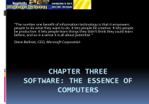 “The number one benefit of information technology is that it empowers people to do what they want to do. It lets people be creative. It lets people be productive. It lets people learn things they didn't think they could learn before, and so in a sense it is all about potential.” Steve Ballmer, CEO, Microsoft Corporation CHAPTER THREE SOFTWARE: THE ESSENCE OF COMPUTERS Chapter Three Outline Software Operating Systems Customized Software Software Quality Word Processing Electronic Spreadsheet Database Software Presentation Graphics Integrated and Workflow Software Unleashing Executive Brainpower What is software? Pressman: “Software is (1) instructions (computer programs) that when executed provide desired features, function, and performance; (2) data structures that enable the programs to adequately manipulate information; and (3) documents that describer the operation and use of the programs.” Sommerville: “Computer programs and associated documentation. Software products may be developed for a particular customer or may be developed for a general market.” Software Characteristic Software is developed or engineered; it is not manufactured in the classical sense. The cost of developing software is focused in engineering process, so the software project cant be managed as in manufacturing project Software doesn’t “wear out”. Although the industry is moving toward component-based construction, most software continues to be custom built. a software component should be designed and implemented so that it can be reused. Software © 2008 Jupiter Images Corporation Software: The computer programs that control the electronic hardware and perform processing tasks for the user. There are two types of software: operating system, a master control program informing the computer how to function, and application, used for performing generalpurpose (e.g., word processing) and industry-specific (e.g., inventory control, accounting, sales and marketing, table management, etc.) tasks. Programmers: The creators of software who are responsible for designing, coding, debugging, and documenting computer programs. Programming Languages: Software programs are written or coded using a particular language, such as COBOL, Java, and C++. Flowchart: A diagram showing how a program works . It also used to understand, evaluate, and design information systems. Click on this Video Link: A demo of Microsoft Visio 2007 that helps IT and business professionals visualize systems and processes. Flowchart Operating System Tasks “Walk-In” Provides User Interface. Two types of interfaces are Command Line Interface (CLI) ( commands typed or selected from textbased menu) and Graphical User Interface (GUI) (standard menu, mouse or touch screen and graphical icons or other visual indicators are used). For example, one front office system the “Walk-In” task, represented by a pair of footprints, is selected by positioning the mouse pointer on the icon and clicking. The most recent trend is Web-enabled hospitality applications that use an Internet browser to display application pages in a GUI format. © 2008 Jupiter Images Corporation Operating System Tasks © 2008 Jupiter Images Corporation Manages the File System. Groups data into logical compartments for storage on the disk, which is filled with directories (file cabinets) and subdirectories (drawers) where files (folders) are kept. Files are kept organized by using a consistent naming scheme that is understandable and easily remembered by users (e.g., short, common names) and storing related files in the same directory. Windows Vista offers an “Instant Search Function” within the Explorer window to locate files difficult to find. This allows users to search for files by extensions (e.g., abc.doc where “doc” is the extension), filenames (abc.doc), or keywords within the documents. Operating System Tasks © 2008 Jupiter Images Corporation Manages the Hardware. The operating system acts as the intermediary between the programs and hardware. For example, when a printer (e.g., Hewlett Packard Color Laserjet) is added in Windows, it is automatically accessible in all other programs. Operating System Tasks Supports Other Programs. The operating system acts as the intermediary between the programs and hardware. For example, when a user requests a word processing program to list word processing document files available on the USB flash drive, it calls on the operating system to perform this task. Operating Systems Linux Mascot Operating System Types: Although Windows and its predecessor, DOS, have dominated the hospitality computer market, Unix and Linux are gaining in popularity due to their power, flexibility, and portability. Unlike Windows and DOS, Unix and Linux are based on open standards like the Internet, allowing them to run on virtually any computer. Click on this Video Link: Dell - Linux 101. Selecting an Operating System: A key consideration when selecting an operating system is the availability of the application. For example, a restaurant company selected Linux, a free operating system similar to Unix, because the software license fees and the computing costs were lower than other operating systems. It took the restaurant, however, five years to find a suitable Linux point of sale solution, a key application in any restaurant operation. © 2008 Jupiter Images Corporation Customized Software Software development has not been able to satisfy the demand for custom software. Consequently, most hospitality users rely on prepackaged business applications. Hospitality vendors are now designing software programs to provide customizable screens, reports, menus, and user interfaces. Click on this Video Link: A discussion on creating customized solutions for restaurants. In 1920, it was predicted that every man, woman, and child would have to be a telephone operator by 1960 to accommodate people using telephones. Oddly enough, this became a reality becaus
