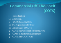 1 Introduction 1.1 Definition 2 COTS based system 2.1 COTS product attribute 2.2 Advantages of COTS 3 COTS characterization framework 4 COTS in System Development 5 COTS APPLICATION Introduction COTS products are highly related to component based software engineering (CBSE) . So before introducing COTS lets have a look in CBSE ? In component-based software engineering , The system is assembled from existing components. CBSE approach emphasize on acquisition and integration of components to accomplish complex and large-scale software solutions. The vision of CBSE is that a new system should be built by assembling components and that the new system should be functional with little effort since the components are already developed, tested, and matured by long execution in many different contexts. Traditional development is changed to focusing on selection, evaluation, integration, and evolution of reusable software components. Today some systems include such complex components that developing them from scratch would be impossible if a profit is required. Benefits of CBSE system quality improvement, shorter time-to-market, and improved management of complexity of software. However, the focus of development move to issues like selection, integration, evaluation and evolution of components in the system. Underestimating the technical risks associated with selection, evaluation, and integration of software components can result in long schedule delays and high development/maintenance cost. Back to COTS Many software developers have define COTS and some of these are mentioned below: Oberndorf It is defined as something that one can buy, ready-made, from some manufacturer's virtual store shelf. It carries with it a sense of getting, at a reasonable cost, something that already does the Definition and classification of COTS: a proposal Accepted at ICCBSS, Orlando (FL) February 4-6, 2002. - 3 / 10 job. The main characteristics of COTS are: (1) it exists a priori, (2) it is available to the general public or (3) it can be bought (or leased or licensed) Oberndorf define it as: It is defined as something that one can buy, ready-made, from some manufacturer's virtual store shelf. It carries with it a sense of getting, at a reasonable cost, something that already does the job. The main characteristics of COTS are: (1) it exists a priori (2) it is available to the general public or (3) it can be bought (or leased or licensed) The meaning of the term “commercial” is a product customarily used for general purposes and has been sold, leased, or licensed (or offered for sale, lease or license) to the general public. As for the term “off-the-shelf”, it can mean that the item is not to be developed by the user, but already exists. Vidger provides a different definition of COTS products. He says: COTS are pre-existing software products; sold in many copies with minimal changes; whose customers have no control over specification, schedule and evolution; access to source code as well as internal documentation is usually unavailable; complete and correct behavioral specifications are not available. According to the perspective of the SEI, COTS product is: sold, leased, or licensed to the general public; offered by a vendor trying to profit from it; supported and evolved by the vendor, who retains the intellectual property rights; available in multiple, identical copies; and used without source code modification. Basili and Boehm According to their definition, COTS software has the following characteristics: (1) the buyer has no access to the source code, (2) the vendor controls its development, and (3) it has a nontrivial installed base (that is, more than one customer; more than a few copies). This definition does not include some kind of products like special purpose software, special version of commercial software, and open source software. COTS-based Systems Carney: he identifies three types of COTS systems as a function of the number of COTS used and their influence on the final system: turnkey systems are built around a (suite of) commercial product(s); intermediate systems are built around one COTS but integrate other components; integrated systems are built by integrating several COTS, all on the same level of importance. A similar classification of COTS-based systems is proposed with the concepts of COTS-solution systems (one substantial product (suite) is tailored to provide a “turnkey” solution) and COTS-intensive systems (many integrated products provide system functionality). COTS products attributes Carney and Long [7] propose two attributes to characterize COTS, origin and modifiability, and provide some examples. There is no discussion of cost and property issues, which seems to be sometimes mixed with the origin axis, while in our opinion it should be discussed separately. No distinction can be found between what needs to be modified in order to make a product work and what can be modified in order to better integrate it into the delivered system. COCOTS A classification of COTS products could be derived from the COCOTS models [1]. Some cost drivers could be used to identify COTS products categories: product maturity, supplier willingness to extend product, product interface complexity, supplier product support, supplier provided training and documentation. Most of these attributes are related to the supplier and market conditions and not to technology. Yakimovich Several researches addressed the integration problem of COTS products; in particular the work by Yakimovich et al. [20] proposes a set of criteria for classifying software architectures in order to estimate the integration effort. The same characteristics are used to classify both the components and the systems. Egyed et al. A methodology for evaluating the architectural impact of software components is proposed by Egyed et al. Such a method allows the selection of both the components and of a suitable architectural style. Th