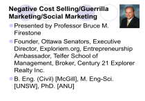 Negative Cost Selling/Guerrilla Marketing/Social Marketing Presented by Professor Bruce M. Firestone Founder, Ottawa Senators, Executive Director, Exploriem.org, Entrepreneurship Ambassador, Telfer School of Management, Broker, Century 21 Explorer Realty Inc. B. Eng. (Civil) [McGill], M. Eng-Sci. [UNSW], PhD. [ANU] Contents Do you want to learn how to really make people want to buy from you? Are you in the solution selling business? Do you know how to get on the ‘same side of the table’ as your customers and clients? Do you want to learn negative cost selling? Do you know how to think in terms of 2-D and 3D business models so that you can not only take care of your clients but your clients’ clients too? Want to understand Guerrilla Marketing and Social Marketing? The Power of the Brand “People like to buy from people they like and trust,” Prof Bruce, Ottawa, Canada “Have you ever bought anything from someone you didn’t like or trust?” Trust (not love!) is the no. 1 thing in life and business Marketing Builds Brand Builds Trust Creates Opportunity to Sell The Power of the Brand Mutual Life Assurance Co. of Canada Clarica Life Insurance Co. New sell-line: "Clarity through dialogue“ Funny TV ads– Clarica Agent appears on scene to clear up W/C ambiguity No call to action How many people head for the phone to buy some insurance? The Power of the Brand None! Separate selling process “VP, Marketing and Sales” Doesn’t know what he/she is doing Living room pitch: “Take care of your kids!” “Where’re you from again? “Pirate Insurance Company of Kinakuta” or “Clarica”– which helps you to close the deal? The Process (1) Marketing through a (2) Marketing Process builds Your Reputation and Brand build Trust in you your Reputation and Brand (3) Trust in you creates an opportunity for you to Sell in a separate Sales Process ‘TRUST POWERS SALES’ Ethics Probably < 1,500 key entrepreneurs in a place like Ottawa Even NYC < 5,500 Protect your reputation Major Arch firm bids on Urban Design of new Ottawa Congress Centre with our group Jumps to winning bidder/takes IP w/out permission Ethics Their name is … DIRT No longer active to any great degree in Ottawa What should they have done? Ask for permission and ask winning bidder to compensate group for their IP– would not even have had to pay it themselves! ‘Intricate’ Your Clients The late Elliot Richardson, former Attorney General of the United States US Counsel to BRING BACK THE SENATORS “Bruce, first we’ll intricate the NHL. Then we’ll get the franchise.” (To honour Elliot, UrbanDictionary.com: http://www.urbandictionary.com/define.php ?term=intricate+) ‘Intricate’ Your Clients “To bring people on board or to get them onside with an idea or a proposal or an initiative of some type by getting them 'intricated' into the process bit by bit, almost without their noticing that they are making a commitment.” ‘Intricate’ Your Clients How do you do this? Become an indispensable part of your clients’ business ecosystems/if you know your client’s History, you can become indispensable/hard to replace How not to do it? E.g., typical Ottawa law firm: Don’t keep clients’ clients tel. #s, email addresses on file Lose client e-documents Don’t know their r.e. client’s Banker, Surveyor, Environmental Consultant, Insurance Broker, Title Insurer, Mortgage Broker, Appraiser or other suppliers Wait to be told what to do Firestone’s Three Laws of Power Selling Law No. 1: SITTING ON THE SAME SIDE OF THE TABLE Law No. 2: SOLUTION SELLING Law No. 3: NEGATIVE COST SELLING SITTING ON THE SAME SIDE OF THE TABLE GradeATechs.com Alt. 1: “We can sell you XYZ virus scan software from Acme Corp. for 200 bucks. What do you think?” Alt. 2: “We can get you XYZ from Acme for $200 or MNO from Beta for $150. If you don’t like either, we can get more quotes for you.” SITTING ON THE SAME SIDE OF THE TABLE In Alt. 2, GradeA becomes: ‘trusted advisor’ Sits on same side of table as client XYZ and MNO (+ all other suppliers) are on the other side GradeA has changed the equation! SELLING TO A CLIENT HELPING A CLIENT BUY! SOLUTION SELLING In r.e., buying a lot is a problem Buying a home is a solution New sub-division with 21 lots to sell ($125,000+) for client in Kanata What to do? Make a deal with top quality home builder to offer his homes w/ lots SOLUTION SELLING How to sell this to builder? Intricate him! Offer him 6 lots for $500 each! $500 each? Yes! SOLUTION SELLING That’s $500 for an 18-month option on those lots Only pays for lots when sold to Homeowner Co-brand sub-division with Builder– piggy back on his marketing SELL SELL SELL SOLUTION SELLING Know your client’s History and Biz Ecosystem Hard to sell a solution when you don’t understand the problem Ace Promotions– problem wanted to sell Golf Pros promo products Issue? Most golf pros don’t have much spare cash SOLUTION SELLING But they have something of great value– a client list Accounting firms and legal firms would like to get access to those clients Eureka! Golf Pros have lots of time and no money Accounting and law firms have lots of money but no money SOLUTION SELLING Let’s solve all three problems (money, time and client access) together By helping 10 Golf Pros buy 1,000 mouse pads each at $5.00 per item That’s a $50,000 order for Ace Promotions Each mouse pad is co-branded: golf pro w/ accounting or law firm Latter put up the dough/former becomes distribution channel (gives them to each golfer) MORE SOLUTION SELLING Ace is also trying to break into the auto dealership biz– SELL SELL SELL Tom Smith Toyota is looking for more car buyers! Ace must solve the problem: “How do you give out promo products to people who are not yet your customer?” Ace comes up with new distribution channel for Smith Toyota! MORE SOLUTION SELLING The humble ice scraper– solves all Ace sells 10,000 ice scrapers to Smith Toyota at $4.00