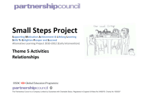 Small Steps Project Supporting Motivation Achievement & Lifelong Learning Skills To Enlighten Prosper and Succeed Alternative Learning Project 2010-2012 (Early Intervention) Theme 5 Activities Relationships The Partnership Council is a Company Limited by Guarantee with Charitable Status. Registered in England & Wales No 3495975. Charity No 1092057 SMALL STEPS PROJECT Relationships SMALL STEPS THEME 5 (6 WEEKS) SEAL THEME 6 Year Group Term Theme number, Theme title, Key social and emotional aspects of learning 5. Relationships • Self-awareness • Managing feelings • Empathy Links to PHSE/Citizenship KS1 Ks1 Developing confidence and responsibility and making the most of their abilities 1a. to recognise what they like and dislike, what is fair and unfair, and what is right and wrong 1b. to share their opinions on things that matter to them and explain their views 1c.to recognise, name and deal with their feelings in a positive way 1d to think about themselves, learn from their experiences and recognise what they are good at Preparing to play an active role as citizens 2c. to recognise choices they can make, and recognise the difference between right and wrong Key Learning Opportunities (6 weeks) Exploration of feelings around relationships, family, friends and coping with loss. Objectives Changing an unfair situation. Being pleased for someone’s achievements. Telling the truth, saying sorry or making amends. Helping someone who is feeling sad or lonely. How to choose an activity Choose the focus of the lesson depending on the children’s needs, age and ability. Find the colour coded activities that relate to the learning focus of your lesson and adapt the activity accordingly to the groups needs. ‘I can’ Statements Colour Coding Activities have been linked to ‘I can statements’ and ‘learning focus’ Each school and group will have it’s own individual Learning Requirements. This is just a general resource in which the objectives and activities can be adapted to the age/needs of the individual children or groups of children. Some of the activities may be suitable for other Themes but have been grouped in the most suitable theme. Links to PHSE/Citizenship KS2 Ks2 Developing confidence and responsibility and making the most of their abilities 1a. to talk and write about their opinions, and explain their views, on issues that affect themselves and society 1b. to recognise their worth as individuals by identifying positive things about themselves and their achievements, seeing their mistakes, making amends and setting personal goals 1c. to face new challenges positively by collecting information, looking for help, making responsible choices, and taking action Preparing to play an active role as citizens 2c. to realise the consequences of anti-social and aggressive behaviours, such as bullying and racism, on individuals and communities Understanding my feelings: Managing my feelings: Understanding the feelings of others: Social skills: Making choices: Knowing myself Belonging: Self awareness: Understanding rights and responsibilities: Cross Curricular Links SMALL STEPS PROJECT Relationships SMALL STEPS THEME 5 (6 WEEKS) SEAL THEME 6 2d. to agree and follow rules for their group and classroom, and understand how rules help them Developing good relationships and respecting the differences between people 4a. to recognise how their behaviour affects other people 4b. to listen to other people, and play and work cooperatively 4c. to identify and respect the differences and similarities between people 4d. that family and friends should care for each other 2d. that there are different kinds of responsibilities, rights and duties at home, at school and in the community, and that these can sometimes conflict with each other 2e. to reflect on spiritual, moral, social, and cultural issues, using imagination to understand other people's experiences 2f. to resolve differences by looking at alternatives, making decisions and explaining choices Developing good relationships and respecting the differences between people 4a. that their actions affect themselves and others, to care about other people's feelings and to try to see things from their points of view 4c. to be aware of different types of relationship, including marriage and those between friends and families, and to develop the skills to be effective in relationships 4d. to realise the nature and consequences of racism, teasing, bullying and aggressive behaviours, and how to respond to them and ask for help 4e. to recognise and challenge stereotypes 4f. that differences and similarities between people arise from a number of factors, including cultural, ethnic, racial and religious diversity, gender and disability 4g. where individuals, families and groups can get help and support. Links to Early Learning Goals ‘I Can Statements’ Nursery Relationships Understanding my feelings: I can tell you how I feel if I am missing someone or have lost someone or something I care about. I can tell when I am feeling sad or angry. I can show someone when I am feeling sad, angry or happy. Managing my feelings: I am beginning to understand that, if someone leaves me, they can still love me. I can remember someone I care about even if they are not there. I can talk about how I can feel better when I am feeling sad or am ‘I Can Statements’ Reception Relationships Understanding my feelings: I can tell you how it feels when things are unfair. Making choices: I can tell you when I think things are fair or unfair. I can tell you what is fair and unfair. I know some ways I can make things fair. SMALL STEPS PROJECT Relationships SMALL STEPS THEME 5 (6 WEEKS) SEAL THEME 6 missing someone. Understanding the feelings of others: I can tell if someone is happy, sad or angry. ‘I Can Statements’ Year1 Relationships Knowing Myself: I know the people who are important to me. Understanding my feelings: I can tell you about something that has made me jealous