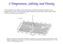 At the simplest level, salinity is the total amount of dissolved material in grams in one kilogram of sea water. Notice that the range of salinity for most of the ocean's water is from 34.60 to 34.80 parts per thousand (°/°°) Figure 6.1 Histogram of temperature and salinity of cold water in the oceans. Height is proportional to volume. Height of highest peak corresponds to a volume of 26 million cubic kilometers per bivariate classof 0.1° C and 0.01 psu. From Worthington (1981). 1. Density is defined as the mass of water per unit volume -use rho (r)as the symbol for density -density units are grams per cubic centimeter (gms / cm3), kilograms per liter (kg/ L) or kilograms per cubic meter (kg/m3) 2. Useful Conversions: 1 cubic meter (m3 ) = 1000 liters (L) 1 L = 1000 cubic centimeters (cm3 ) thus 1 m3 = 1,000,000 cm3 = 106 cm3 3. Water density -density of freshwater at 4°C is 1.0000 gms/cm3 or 1.000 kg/liter or 1000 kg/m3 4. Density range in ocean is from about 1.020 to 1.070 gms/cm3 -the changes in density are caused mainly by variations in pressure, salinity and temperature -colder water more dense -saltier water more dense -higher pressure causes density increase -pressure increases with depth due to the mass of water above 5. Density (r) variations in the ocean are in the parts per thousand range -that is, between 1.020 and 1.070 gm/cm3 the density changes by 50 parts per thousand -(multiply 1.020 and 1.070 by 1000 and subtract one from the other) -we also use s (Sigma) to denote density, where s = (r - 1)*1000 -sigma is useful to express the small changes in density (parts per thousand) that we observe in the ocean -thus if density of water is 1.025 gms/cm3, r = 1.025 gms/cm3 and s = 25 -remember that to convert a s value to density (r) then divide by 1000 and add 1, -e.g. = 28 means r = 1.028 gms/cm3 or 1028 kg/m3 How much does the seawater density increase upon cooling from 20° to 0°C? -seawater density increases from 1.0240 gm/cm3 (1024.0 kg/m3) at 20°C to 1.0273 gm/cm3 (1027.3 kg/m3) at 0°C (at a constant salinity = 34) -thus s increases from 24.0 to 27.3 1 1 7 The potential temperature decrease with depth is greatest in top 1000m (Fig. 6) -the depth region where temp decrease is greatest with depth is called the thermocline -the rate of change of temperature with depth is called the temperature gradient -a gradient expresses the rate of change of one variable relative to another variable, -i.e., in this case the depth gradient in Potential Temperatrue = ∆q/∆Z -the steepness of the depth gradient in temperature depends on location -it is greatest in the warm tropical ocean and least in the cold polar ocean 2 2 Physical Properties of Water Water molecules are asymmetrical, and this has very important consequences. 1. The electric charge is asymmetrical, causing strong attraction between molecules, resulting in: * High melting temperature. * High boiling point. * High heat of vaporization. * High surface tension. 2. The molecule has a large dipole moment, resulting in: * High dielectric constant. * Great power for dissolving inorganic chemicals, which leads to high salinity and conductivity of sea water. 3. The high conductivity causes: * Rapid electrolysis of metals in sea water, causing rapid corrosion. * The motion of sea water in Earth's magnetic field creates a potential. Measurements of the potential can be used for measuring the velocity of oceanic currents. 4. Water molecules pack together either in tetrahedral structures or in spherical, close-packing, structures of ice. * The properties of the tetrahedral structure, which is more common at higher temperatures, is superimposed on the properties of the ice structure,which is more common at lower temperatures. * The conflict between these two structures leads to the parabolic shape of water properties as a function of temperature (Fig. 6.2). 5. Tetrahedral packing is denser than the spherical close packing of ice . * The maximum density of pure water is above the freezing point. * Ice is less dense than water. * The maximum density of sea water, however, is at freezing. Figure 6.2 The shape of the water and ice molecules determines the density. The ice molecule is packed in a lattice that takes more volume than water molecules. Hence water expands on freezing. From Thurman (1985). 3 Potential Temperature, Potential Density, and Sigma As water sinks and flows into the deep ocean, it changes depth and moves far away from its original source at the surface. To trace the movement of water in the deep ocean, we must compare temperature at one depth with temperature at another. This is possible, but it requires calculating changes in temperatures due to compressibility of sea water. As pressure increases, water is compressed, and the compression does work on the water. This causes the water to warm. To understand the warming, consider a cube containing a fixed mass of water. As the cube sinks, its sides move inward as the cube is compressed. Potential Temperature To avoid calculating temperature changes due to compressibility of water, oceanographers (and meteorologists who have the same problem in the atmosphere) use the concept of potential temperature. Potential temperature is defined as the temperature of a parcel of water at the sea surface after it hasbeen raised adiabically from some depth in the ocean. Raising the parcel adiabically means that it is raised in an insulated container so it does not exchange heat with its surroundings. Of course, the parcel is not actually brought to the surface. Potential temperature is calculated from the temperature in the water at depth, the in situ temperature. Density and sigma-t Density is another important property of sea water. Less dense water floats on more dense water, and if we wish to determine how water can move within the ocean, we need to be able to calculate the density of water with an accuracy of a few parts per million. Density of water at the sea surface is 