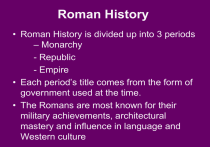 • Roman History is divided up into 3 periods
