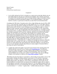 Mariela Tinajero MBA 6410 Professor Doris Geide-Stevenson Assignment 5 1. Use the IMF reading from Week 0 to identify one country that has had high inflation rates (at least double-digit) over the past year. Find the rate of inflation, rates of money growth and the current level of nominal interest rates for the high-inflation country of your choice. Relate your finding to the theories presented in chapter 4 of our textbook (Mankiw). The central bank for a country is a good source of data (if you cannot find it on the dismalscientist). According to the IMF article, Venezuela seems to have a high inflation rate since its CPI in 2009 was 27.1. This means that Venezuela had an average inflation rate of 27.1% for 2009. While its nominal interest rates amounted to a lending rate of 20.31%, savings rate of 13.43%, and 90 day deposit rate of 15.58% for the six main commercial and universal banks in 2009. In a similar manner for 2009 Venezuela’s narrow money (M1) growth amounted to 25.18%, broad money (M2) amounted to 21.7%, and extended broad money (M3) amounted to 21.17% (Banco Central de Venezuela, 2010). According to Mankiw the cost to Venezuela in having such high inflation rates includes shoeleather costs, menu costs, inefficient allocation of resources from constant inflation, tax laws which may cause problems when inflation isn’t considered, and the inconvenience from changing currency. For some loaners this may have been a loss in money from unanticipated inflation because borrowers are repaying in cheaper money. The one benefit that might apply to Venezuela according to Mankiw is that wage cuts can take place without cutting real wages by making inflation do the work. This makes since because i = r + π (i = nominal interest rate, r = real interest rate, π = inflation), for example say a person in Venezuela nominal wage was 10 and their real wage was 6 that means that inflation is 4. So if inflation increases to 6 and nominal wage cannot change from 10 then the employee’s real wage can be cut to 4. It’s also important to not the large increases in money supply in Venezuela which is most likely the cause of such inflation. 2. Compare the yield on the 'regular' 5-year and 10-year Treasury notes with the yield on the inflation-indexed 5-year and 10-year Treasury notes (bloomberg.com). The difference between the yields on the regular versus the inflation-indexed bonds can be interpreted as market expectations of inflation. According to this interpretation, what is the average expected inflation rate over the next 5, and next 10 years? Explain. How do your findings compare to the statement on inflation in the latest FOMC statement? Explain. Bloomberg.com states the yield of a 5 year bond as 1.26% and the 10 year yield as 2.51%. In the same instance it declares the inflation indexed 5 year bond as -0.19% and the 10 year bond inflation index as 0.695%. To get the average inflation you subtract the regular yield with the inflation indexed yield. This equates to 1.45% for the 5 year bond and 1.82% for the 10 year. Expected inflation is surmised in that way because if for example the regular yield was equal to 4% but inflation went up by 2% the real yield would be 2%. So if the inflation indexed yield was 2% and inflation rose by 2% you would actually earn 4% regular yield. Therefore, it makes since to use the formula i = r – π where i = regular yield, r = inflation indexed yield, and π = inflation. We can then solve for π to solve for the expected inflation for the 5 year and 10 year bond. The FOMC states “inflation is likely to remain subdued for some time before rising to levels the Committee considers consistent.” They will continue to set the federal fund rate to 0 to ¼ percent which seems to apply since inflation seems to stay fairly constant from 1.45% for a 5 year bond and rises to a target of 1.82% for the 10 year bond. Therefore the FOMC sees no need to raise the federal funds rate but perhaps in the future when it reaches its target inflation rate it will. 3. Real GDP (Y) can be decomposed into the sum of spending by consumers (C), firms (I), the government (G) and net exports (X-M). Y = C + I + G + NX. A common approach taken in exploring real GDP developments is to explore how each of these four spending components identified will develop in the near future. For example, if consumer confidence (an example of a forward looking indicator) is increasing, this is usually taken as a signal that C will be increasing at a 'healthy' growth rate in the near future. If consumer confidence is decreasing, then C is expected to be flat. Since the spending components feed into real GDP (go back to the circular flow diagram), the development of C gives some indication about near future developments in real GDP or economic growth. Thus, one can explore expected changes in C, I, G, and NX to get a handle on the expected real GDP growth for the next quarter or year. Use the Semiannual Report on Monetary Policy from July 21, 2010 (Part 2) to summarize the data (at least one solid paragraph) on C, I, G, NX and the Fed assessment of the current and future development of each of the four spending components. Make sure you review and briefly state the textbook definition of each spending component. Mankiw describes consumption as consumer purchases of goods and services; investment as firm and individual purchases of goods and services used to add to their accumulation of assets; government purchases as purchases by the federal, local, and state governments of good and services; and lastly net exports as exports minus imports. Currently consumption has increased for the current year coupled with an increase in real disposable personal income. However, equity (assets-liabilities) has fallen and has led to a lower consumer sentiment. On a similar note household debt (debt payments/disposable personal income) has fallen. As for housing sales increased in the spring, the likely result of ta