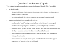 Question--Last Lecture (Chp. 6) Two main alternative reproductive strategies in male bluegill fish: (heritable) • territorial male: – large colorful males that defends territories and solicits females to release eggs so that he can fertilize the eggs – territorial males will give rise to young that are large and brightly colored • sneaker males that becomes a female mimic: – sneaker males “sneak” matings when the large territorial male is preoccupied – sneaker males are younger and smaller and possess a light body coloration – as sneaker males age they become female mimics, their body size increases and they develop a coloration pattern with dark vertical bars (like females) – female mimics (large drab males) look like females and they hang around in the vicinity of real females – female mimics are ready to release sperm when the female releases her eggs in response to the behavior of the territorial male Chp 7: Hormonal Influences on Courtship Behavior Overview: • Courtship tends to be a sexually dimorphic response: – in many species, courtship is initiated largely by males – links to female preferences and male’s comparative quality • Ex. Production of EODs in Weakly Electric Fish: – fish communicate via electric organ discharges (EODs) – gonadal steroids influence the display of the EOD and of “chirping”--the male’s courtship response • Ex. Production of the “mating call’ in Xenopus (clawed frog) – the ‘mating call’ is used to attract females to a breeding area – gonadal steroids act to organize and activate the ‘mating call’ • Ex. Production of “song” by song birds – males produce song to attract females for mating – gonadal steroids act to organize and activate both learning and production of song Courtship As a Sexually Dimorphic Response Courtship tends to be a sexually dimorphic response. For example: • In most fish species, males do all or the majority of “chirping.” • In frogs like Xenopus, only males can produce the “mating call.” • In several bird species, only males produce song. Why are courtship responses sexually dimorphic? • Trivers (1985) suggests that sex differences in courtship behavior reflect differences in the relative investment of energy and time in reproduction. – females spend more time and energy – males spend less time and energy Investment of energy & time in reproduction: Males Energetic investment in production of gametes Number of gametes produced over a lifetime Females Produce sperm, which consist of male’s chromosomes surrounded by a protein coat and flagellum Produce eggs, which consist of female’s chromosomes and yolk, a high energy nutritive substance “cheap” “expensive” Produce large numbers of sperm Produce small numbers of eggs Ex. humans (men), 1 ejaculation can release 100 million sperm Ex. humans (women), over lifetime, see production of a few hundred eggs Investment of energy & time in reproduction: Males Care of offspring Less time and energy is devoted in care of young Females Much greater time and energy is devoted to care of young development in utero (gestation) feeding and caring for young once born or hatched Why is courtship largely initiated by males? female is limited by costs of making and rearing young female maximizes her reproductive investment by choosing to which males will fertilize her eggs males must demonstrate their comparative quality “Good” male: • male with high genetic quality (good genes) • male that cares for young (by feeding or protection) To mate with females: • winning territorial battles • showing specific courtship responses • possessing other traits (e.g., colorful plumage) Courtship in the Weakly Electric Fish Weakly electric fish communicate and navigate by use of electrical signals. • electrical signals are called electric organ discharges (EODs) • EOD is produced by the electric organ located in the tail – EOD is spontaneously produced (important for navigation in murky waters and for identification of others in environment) – EOD is also produced in response to cues that trigger mating: rain triggers the production of “chirping” by males (courtship response) • EOD is perceived by specific sensory cells called electroreceptors – electroreceptors are concentrated in the head region – transduce electrical stimuli into chemical stimuli to activate sensory pathways in brain Courtship in the Weakly Electric Fish The electric organ is involved in producing EOD: • neurons within the hindbrain control production of spontaneous EODs – pacemaker nucleus-->electromotor neurons in spinal cord-->electric organ – electric organ consists of modified muscles cells called electrocytes that produce the EOD • neurons in forebrain control production of EODs in response to various cues (e.g., EODs produced by females or to activating cues like “rain”) – prepacemaker nucleus-->pacemaker nucleus will stimulate production of EODs The EOD varies in “form”: • discharge frequency: number of pulses produced per given length of time; frequency discharge can be low or high • pulse duration: the waveform may be long or short • there are species differences and sex differences in the form of the EOD Courtship in the Weakly Electric Fish • Spontaneous EODs provide information about sex and age of individual: • mature males mature males: – low discharge frequency (50-90 Hz) – long pulse duration • mature females: – high discharge frequency (100-150 Hz) – short pulse duration • juveniles: – intermediate values for both mature females Courtship in the Weakly Electric Fish Gonadal steroids influence discharge frequency and pulse duration of EOD: • androgens act to broaden pulse duration and lower discharge frequency • estrogen acts to increase frequency discharge Female Male EOD of low frequency and long duration castrate male further decrease in frequency and inc