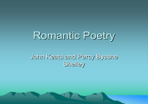 Romantic Poetry John Keats and Percy Bysshe Shelley Outline • • • • • • • John Keats; the odes Ode on a Grecian Urn “Bright Star” “La Belle Dame san merci” “Ozymandias” Notes Lord Byron: “She Walks in Beauty” (for reference) Romantic Age First Generation: The emphasis on • Idealism & Quest – Wordsworth: Nature and correspondence between Nature and human nature (e.g. US – Whitman, Dickinson) – Wordsworth: Common people (“London”) – “Natural Supernaturalism” –Coleridge and Blake: Art (“Tiger”), Imagination & Vision (“Kubla Khan” “The Rime of Ancient Mariner”) • Feeling (“spontaneous overflow of powerful feeling” “emotion recollected in tranquility”) • Individualism vs. (e.g. “I Wandered Lonely as a Cloud” and “Rose”) Romantic Age 2nd Generation: The emphasis on – Feeling – Art & Imagination (e.g. “Ode on a Grecian Urn”) & Vision – Individualism & Quest for the remote (myth) – Breaking down more boundaries (e.g. the sensual, the moral); – against authority (“Ozymandias”) John Keats • October 31, 1795-February 23, 1821; died at the age of 25 of tuberculosis . Published only 54 poems. • Originally a surgeon (apothecarysurgeon) and changed his mind in 1813-1814. • Literary Creation: 1816 – 1821 [love with Fanny Browne 1818- the odes 1819] poverty • 1820 –symptoms of TB; • 1821 -- "Here lies one whose name was writ in water." • Major Ideas: Life as “the Vale of soul-making.” Shakespeare with “negative capability” (like a chameleon變色龍—imaginative identification with the other). Keats’ Great Odes 1. “Ode to Psyche” --the goddess Psyche in the arms of Cupid 2. “Ode on a Grecian Urn” – art 3. “Ode to a Nightingale” --art 5. “Ode on Indolence” 6. 'To Autumn‘ – a finale • 4. “Ode on Melancholy” She dwells with Beauty—Beauty that must die; And Joy, whose hand is ever at his lips Bidding adieu and aching Pleasure nigh, Turning to poison while the bee-mouth sips • Journey to (or Quest) artistic eternity and transcendence and return to the mortal world Ode on a Grecian Urn 1. Pay attention to a) the form of address (apostrophe) and the object of address in different stanzas, which imply the speaker’s different relations with the urn; 2. Pay attention to the use of metaphors in calling/describing the urn; 3. The two sides of the urn: their differences and similarities 4. The closing lines—how to interpret them. Blue—metaphor; red– sound Underline-- rhetoric skills: questions STANZA I Thou still unravish'd bride of quietness, Thou foster-child of silence and slow time, Sylvan historian, who canst thus express A flowery tale more sweetly than our rhyme: What leaf-fring'd legend haunts about thy shape Of deities or mortals, or of both, In Tempe or the dales of Arcady? (1) What men or gods are these? What maidens loth? What mad pursuit? What struggle to escape? What pipes and timbrels? What wild ecstasy? Blue—metaphor; Red – sound Underline-- rhetoric skills: Imperative, concession, repetition STANZA II Heard melodies are sweet, but those unheard Are sweeter; therefore, ye soft pipes, play on; Not to the sensual ear, but, more endear'd, Pipe to the spirit ditties of no tone: Fair youth, beneath the trees, thou canst not leave Thy song, nor ever can those trees be bare; Bold Lover, never, never canst thou kiss, Though winning near the goal--yet, do not grieve; She cannot fade, though thou hast not thy bliss, For ever wilt thou love, and she be fair! Blue—metaphor; Orange – sound Underline-- rhetoric skills: Exclamation; repetition STANZA III Ah, happy, happy boughs! that cannot shed Your leaves, nor ever bid the Spring adieu; And, happy melodist, unwearied, For ever piping songs for ever new; More happy love! more happy, happy love! For ever warm and still to be enjoy'd, For ever panting, and for ever young; All breathing human passion far above, That leaves a heart high-sorrowful and cloy'd, A burning forehead, and a parching tongue. Blue—subjects; Orange – sound Underline-- rhetoric skills: Exclamation; repetition STANZA IV Who are these coming to the sacrifice? To what green altar, O mysterious priest, Lead'st thou that heifer lowing at the skies, And all her silken flanks with garlands drest? What little town by river or sea shore, Or mountain-built with peaceful citadel, Is emptied of this folk, this pious morn? And, little town, thy streets for evermore Will silent be; and not a soul to tell Why thou art desolate, can e'er return. Blue—metaphor; Orange – sound Underline-- rhetoric skills: Exclamation; repetition STANZA V O Attic shape! Fair attitude! with brede Of marble men and maidens overwrought, With forest branches and the trodden weed; Thou, silent form, dost tease us out of thought As doth eternity: Cold Pastoral! When old age shall this generation waste, Thou shalt remain, in midst of other woe Than ours, a friend to man, to whom thou say'st, "Beauty is truth, truth beauty,"--that is all Ye know on earth, and all ye need to know. Ode on a Grecian Urn 1. Using apostrophe to speak to the Urn in order to enter its realm (the realm of art and permanence); 2. The process: question empathy confirmation differentiation between the human and the artistic. Ode on a Grecian Urn 1. Using apostrophe to address and speak to the Urn in order to “enter” its realm (the realm of art and permanence); • The Emphathic(神入﹚/Ekphrastic (讀畫/藝術作 品) Process: 1) approach: question understanding confirmation 2) differentiation between the human and the artistic – A Creative Process: * After all, the urn is just an ancient utensil; Keats creates its “artistic” meanings by teasing out the dualities between time and timelessness/frozen moments, sound and silence, thinking and thoughtlessness, the static and the eternal. Note (1) • Tempe and Arcady: considered as heavenly paradise in Greece, frequently mention