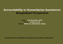 Accountability in Humanitarian Assistance: Bangladesh Perspective Date : 11th November 2010 Time : 18.30 to 21.30 Venue: BRAC Inn, Mohakhali, Dhaka Shwakat Ali Tutul, Mustafa Kamal Akanda and Sanat K. Bhowmik Accountability in Humanitarian Assistance: Bangladesh Perspective Accountability: In HAP perspective Accountability is the means by which power is used responsibly and humanitarian accountability involves taking account of, and accounting to disaster survivors. Humanitarian Assistance: to assist disaster survivors. In the context of Bangladesh program support like health, education, micro credit, rights based program, DRR programs etc are also Humanitarian assistance as these programs for the poor and hard core poor people. Bangladesh Perspective: Inception of HAP, practices of HAP principles and standards by HAP partner agencies working in Bangladesh. 1 Objectives of the presentation To explore HAP inception and promotion in Bangladesh To uphold the current status of HAP standards in the practice level of HAP partner and sub-partner agencies. To sensitize the key stakeholders for promoting of HAP culture. 2 How we prepared this Presentation Onsite and email Consultation: Beneficiaries, Staffs, Representatives of HAP Peer support group, HAP secretariat colleagues, consultant and disaster experts. Program visit : DCA’s Aila response program at Khulna, Dacop in this program they are piloting HAP principles and accountability standards in the practice level. Web site visit and reports and documentation read out: HAPI and HAP peer support group’s in Bangladesh. 3 HAP partners in Bangladesh Among total of 62 HAPI partners the following agencies are working in Bangladesh. Among them Dan Church Aid, World vision, CAFORD(Caritas), Concern, CARE, Christian Aid, Save the Children – UK, Tear Fund, Muslim Aid and Oxfam GB are International agencies and COAST Trust and CODEC are national agencies. Among 8 HAP certified partners Dan Church Aid and Tear fund have activities here. COAST Trust and Muslim Aid are now in certification process. We also came to learn that Rupantar, DSK, Gono Unnoan Prochesta (GUP) are willing to get HAP membership. 5 Inception of HAPI in Bangladesh Accountability and Quality Management Standards Development Workshop 31st May to 1st June 2006: Total 31 participants with 4 beneficiaries (who got aid support during a disaster) were present to share their experiences in HAP I accountability standards development process. Oxfam Bangladesh was co hosted the workshop. One of the core objectives was to discuss the draft of the HAPI standards and to ensure that they are: Relevant Measurable Feasible Affordable 6 Overview of HAP's Initiatives in Bangladesh: After critical period passed over of cyclone Sidr and NGOs were initiating long term rehabilitation and reconstruction programs. Under the New Emergencies Policy, a HAP-led initiative in Bangladesh was agreed to promote good practice through supporting efforts to develop and improve immediate activities and systems that focus on quality and accountability to disaster survivors during the Sidr response. The strategy for this initiative was: To strengthen staff understanding of Principles of Accountability to disaster survivors and of their agencies’ compliance with these Principles; HAPI completed the initiatives in three phases 6 Phase 1: Accountability Self-Assessments January 2008: The initiative started with a workshop ( 23rd-24th January) on accountability self-assessments attended by key staff from 14 NGOs. HAPI Team and staff from participating agencies undertook self-assessments during field visits in the most severely Sidr-affected in Bagerhat, Patuakhali and Burguna Districts. In total, six field visits were conducted with: Save the Children UK; Christian Aid and their partner GUP; Concern Worldwide and their partner SPEED Trust; CARE Bangladesh; HEED Bangladesh; and Muslim Aid. The field visits focused on reviewing practice against the HAP Standard Benchmarks in particular information dissemination, community engagement, and complaint-handling. 7 March 2008; Lessons Learnt Workshop: On the 25th March 2008, 17 agencies met in Dhaka to review progress and lessons learnt to date. The participants shared good practice examples of humanitarian accountability i.e. notice boards with key information, regular monitoring of beneficiary satisfaction, village committees which make project related decisions on behalf of their communities and so on. Workshop participants also highlighted that offering beneficiaries opportunities to provide suggestions has changed mind-sets of staff, and involving local communities in beneficiary selection improves the effectiveness of the intervention. 8 Phase 2: Focused Support on Complaint and Response Mechanism: To strengthen existing mechanisms and develop more effective ways of handling complaints, HAPI conducted a three-day workshop in Dhaka, attended by 20 participants from 12 NGOs. The workshop was held on August 2008 All participants identified some action points they would take forward these include: Seek senior manager commitment; Orient staff, partners and beneficiaries; Engage beneficiaries in the design of the mechanism; Develop a staff Code of Conduct and organizational complaints handling policy and procedure; 9 Phase 3: The After Action Review November 2008 The After Action Review (AAR) carried out in November 2008 to examine the progress made against the aims of HAP’s initiative and reviewed the appropriateness and impact of HAP’s engagement in terms of influencing field practice and humanitarian quality management systems As part of the AAR HAP team carried out two main activities: Visit to a project site of interested agencies that went through the selfassessment process. AAR workshop for participating agency staff and community representatives who had first hand experience of the Sidr response 10 Develop of Peer Support Group: At the end of the after action review