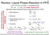 L7-1 Review: Liquid Phase Reaction in PFR Be able to do these 4 steps, integrate & solve for V for ANY ORDER RXN LIQUID PHASE: Ci ≠ f(P) → no pressure drop 2A → B -rA = kCA2 2nd order reaction rate Calculate volume required to get a conversion of XA in a PFR dX A rA Mole balance dV FA0 Rate law rA kCA 2 Stoichiometry (put CA in terms of X) CA CA0 (1 X A ) dX A dV Combine FA0 k CA0 2 XA 0 V dX A 1 XA 2 dV See Appendix A for integrals frequently used in reactor design 0 k CA02 1 X A FA0 k CA02 2 FA0 XA 1 X A V Liquid-phase 2nd order reaction in PFR Slides courtesy of Prof M L Kraft, Chemical & Biomolecular Engr Dept, University of Illinois at Urbana-Champaign. L7-2 Review: Liquid Phase Reaction in PBR LIQUID PHASE: Ci ≠ f(P) → no pressure drop Be able to do these 4 steps, integrate & solve for V for ANY ORDER RXN 2A → B -r’A = kCA2 2nd order reaction rate Calculate catalyst weight required to get a conversion of XA in a PBR dX A r 'A Mole balance dW FA0 r 'A kCA 2 Rate law CA CA0 (1 X A ) Stoichiometry (put CA in terms of X) dX A dW Combine FA0 k CA0 2 XA dX A 0 1 XA W 2 dW 0 k CA02 1 X A FA0 k C A02 2 FA0 XA 1 X W A Liquid-phase 2nd order reaction in PBR Slides courtesy of Prof M L Kraft, Chemical & Biomolecular Engr Dept, University of Illinois at Urbana-Champaign. L7-3 Review: Isobaric, Isothermal, Ideal Gas-Phase Rxns in Tubular Reactors Gas-phase reactions are usually carried out in tubular reactors (PFRs & PBRs) • Plug flow: no radial variations in concentration, temperature, & ∴ -rA • No stirring element, so flow must be turbulent FA0 FA C j0 jCA0 XA C j0 jCA0 XA P T0 Z0 Cj GAS PHASE: C j 1 XA 1 XA P0 T Z 1 1 1 Stoichiometry for basis species A: CA0 1 XA CA0 CA0 XA CA CA 1 XA 1 XA Slides courtesy of Prof M L Kraft, Chemical & Biomolecular Engr Dept, University of Illinois at Urbana-Champaign. Review: Effect of on u and XA L7-4 NTf NT0 Change in total # moles at X A 1 NT0 total moles fed : expansion factor, the fraction of change in V per mol A reacted u0: volumetric flow rate u varies if gas phase & moles product ≠ u u 1 X Z T P0 0 A moles reactant, or if a DP, DT, or DZ occurs Z 0 T0 P No DP, DT, or DZ occurs, but moles product ≠ moles reactant → u u0 1 X A • = 0 (mol product = mol reactants): u u0: constant volumetric flow rate as XA ↑ < 0 (mol product < mol reactants): u < u0 volumetric flow rate ↓ as XA ↑ Q1: For an irreversible gas-phase reaction, how does the residence time and XA change when < 0? a)They don’t b)The residence time is longer & XA increases c)The residence time is longer & XA decreases d)The residence time is shorter, & XA decreases e)The residence time is shorter & XA increases Slides courtesy of Prof M L Kraft, Chemical & Biomolecular Engr Dept, University of Illinois at Urbana-Champaign. Review: Effect of on u and XA L7-5 NTf NT0 Change in total # moles at X A 1 NT0 total moles fed : expansion factor, the fraction of change in V per mol A reacted u0: volumetric flow rate u varies if gas phase & moles product ≠ u u 1 X Z T P0 0 A moles reactant, or if a DP, DT, or DZ occurs Z 0 T0 P No DP, DT, or DZ occurs, but moles product ≠ moles reactant → u u0 1 X A • = 0 (mol product = mol reactants): u u0: constant volumetric flow rate as XA increases • < 0 (mol product < mol reactants): u < u0 volumetric flow rate decreases as XA increases • Longer residence time than when u u0 • Higher conversion per volume of reactor (weight of catalyst) than if u u0 • > 0 (mol product > mol reactants): u > u0 with increasing XA • Shorter residence time than when u u0 • Lower conversion per volume of reactor (weight of catalyst) than if u u0 Slides courtesy of Prof M L Kraft, Chemical & Biomolecular Engr Dept, University of Illinois at Urbana-Champaign. L7-6 Review: Isobaric, Isothermal, Ideal Rxn in PFR GAS PHASE: Be able to do these 5 steps, & solve for V for ANY ORDER RXN Ci = f() → no DP, DT, or DZ 2A → B -rA = kCA2 2nd order reaction rate Calculate PFR volume required to get a conversion of XA dX A rA Mole balance dV FA0 rA kCA 2 Rate law CA0 1 X A 1 XA Stoichiometry (put CA in terms of X) CA Combine dX A k CA0 1 X A dV 1 XA 2 FA0 2 V V FA0 k CA0 FA0 k CA02 2 XA 0 1 XA 2 dX A 2 1 XA 2 Integral A-7 in appendix 1 2 X A 2 1 ln 1 X A 2 X A 1 XA Gas-phase 2nd order rxn in PFR no DP, DT, or DZ Slides courtesy of Prof M L Kraft, Chemical & Biomolecular Engr Dept, University of Illinois at Urbana-Champaign. L7-7 Review: Pressure Drop in PBRs GAS PHASE: A → B -r’A = kCA2 2nd order reaction rate Calculate dXA/dW for an isothermal ideal gas phase reaction with DP dX A FA0 r 'A Mole balance dW Rate law r 'A kCA 2 CA Stoichiometry (put CA in terms of X) Combine Relate P/P0 to W (Ergun equation) dX A dW CA0 1 X A P 1 X A P0 k CA02 FA 0 1 XA 2 P 2 1 XA 2 P0 dP T P0 1 X A dW 2 T0 P P0 Ergun Equation can be simplified by using y=P/P0 and T=T0: dy 1 X A dW 2y Simultaneously solve dXA/dW and dP/dW (or dy/dW) using Polymath Slides courtesy of Prof M L Kraft, Chemical & Biomolecular Engr Dept, University of Illinois at Urbana-Champaign. L7-8 Review: Ergun Equation dP T P0 Calculates pressure drop in a packed bed. 1 X A This equation can be simplified to: dW 2 T0 P P0 Differential form of Ergun equation for pressure drop in PBR: y P P0 T dy 1 X A dW 2y T0 NTf NT0 y A0 NT0 1 : fraction of solid in bed = 20 A c c 1 P0 volume of solid total bed volume AC: cross-sectional area C: particle density : constant for each reactor, calculated using a complex equation that depends on properties of bed (gas density, particle size, gas viscosity, void volume in bed, etc) : constant dependant on the packing in the bed Slides courtesy of Prof M L Kraft, Chemical & Biomolecular Engr Dept, University of Illinois at Urbana-Champaign. L7-9 L7: Unsteady-State Isothermal Reactor Operation: CSTR Start-Up and Semi-Batch Reactors CBu0 Semi-batch A A+B V0 V0 + u0t Vf start time t end • Time required to reach steady-state after CSTR start-up • Predicting conce